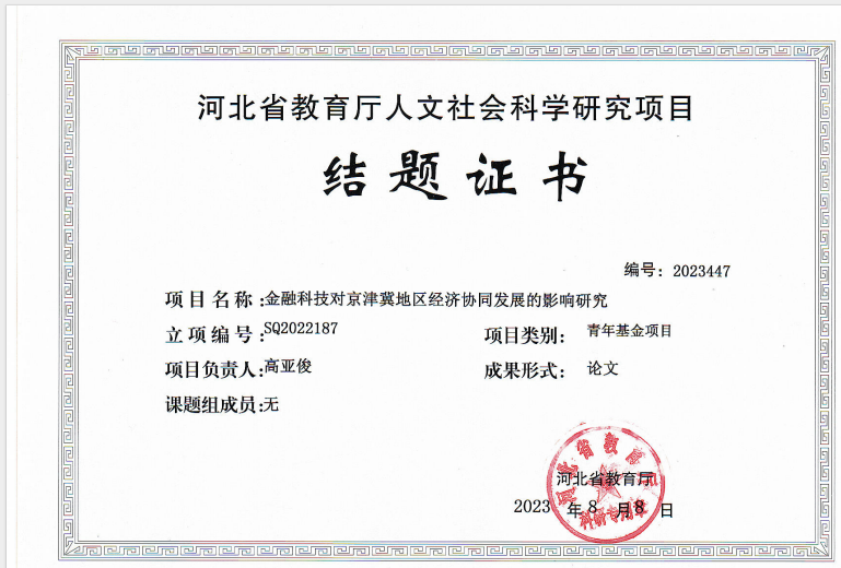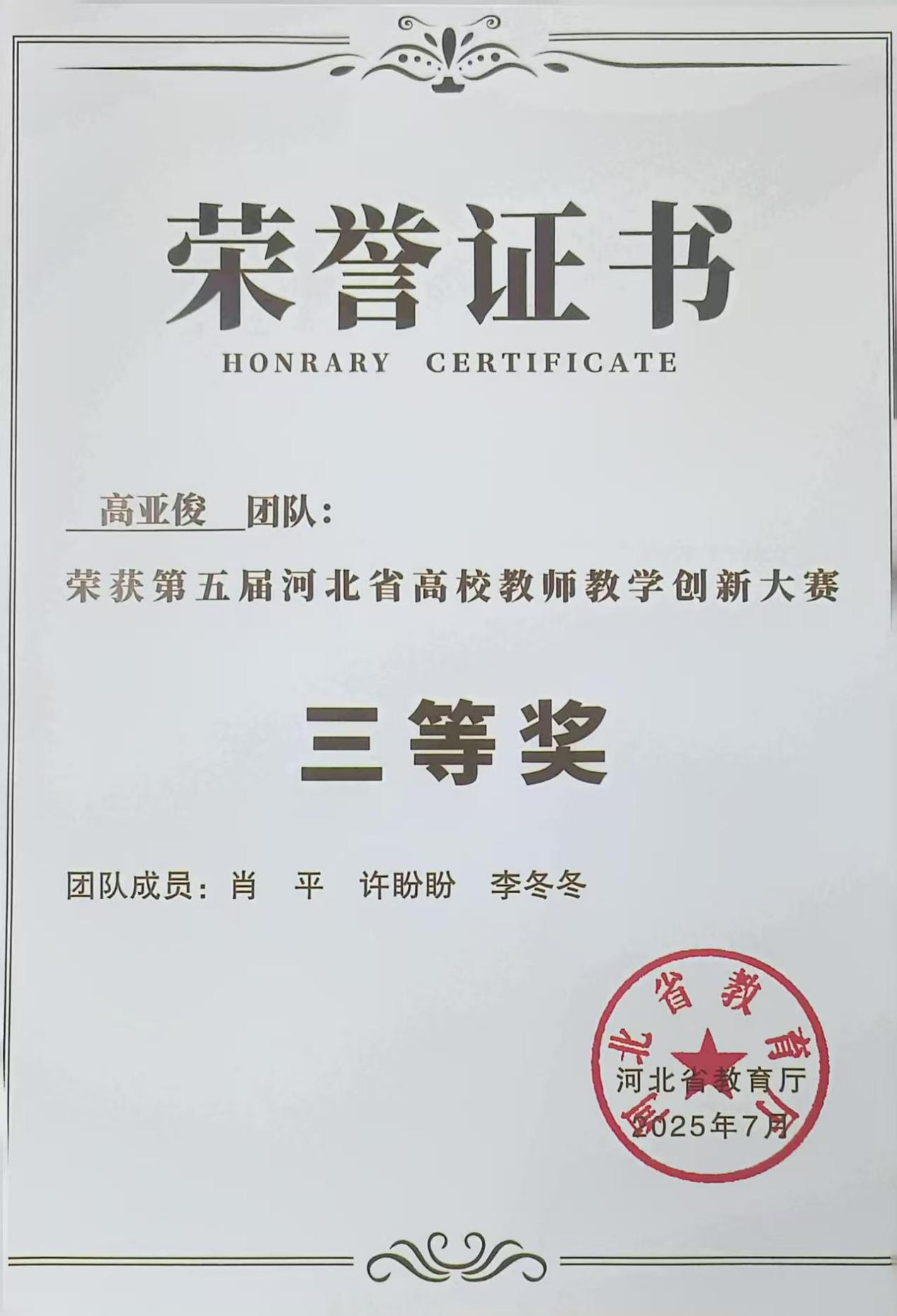 在高亚俊老师的带领下,科研团队近几年取得丰硕成果,发表专著、专利各一项,主持负责科研项目7项,厅级课题3项,发表论文十余篇,带领老师们参加河北省高校教师创新大赛并获得三等奖。