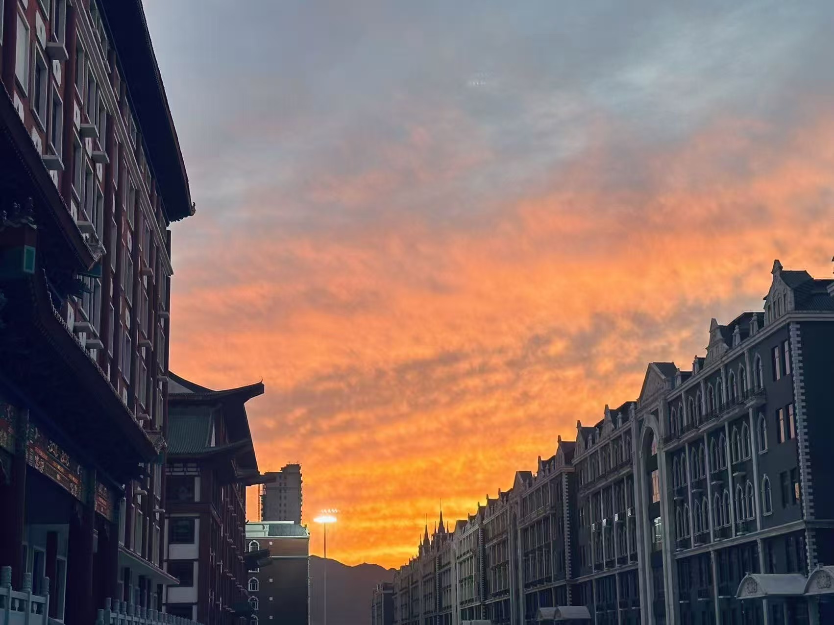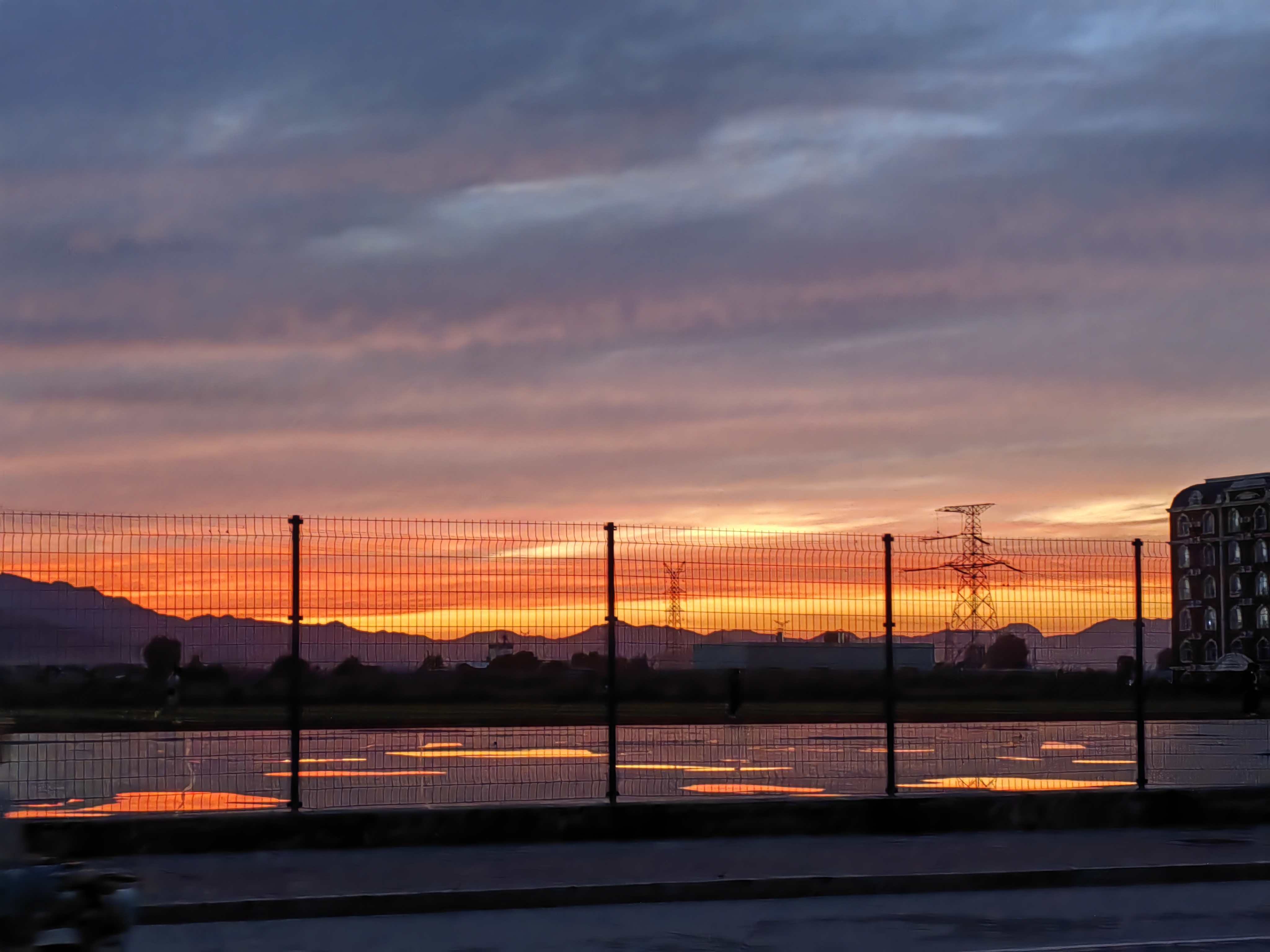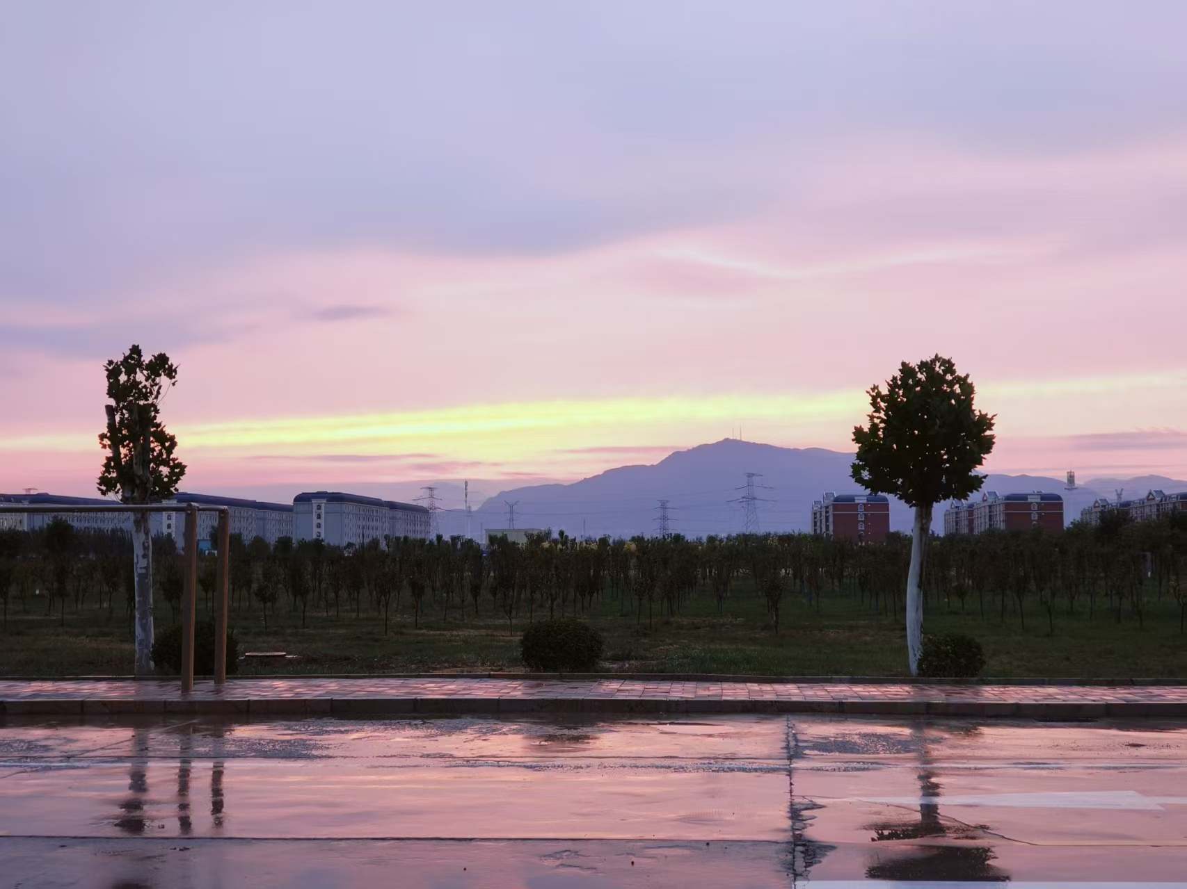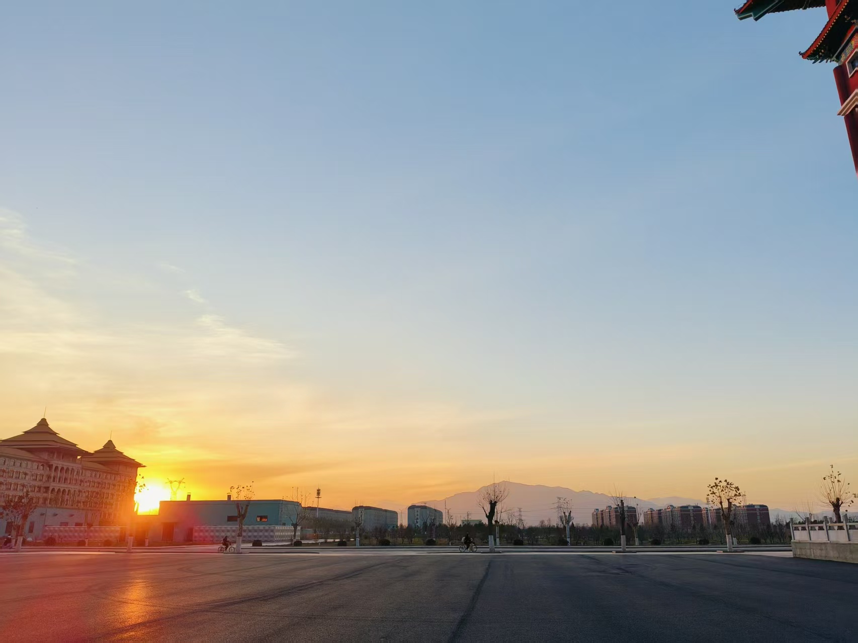 它淌过操场的栏杆,把塑胶跑道染成温柔的橘红,早练的同学踩着霞光奔跑,身影被拉得轻快;又爬过篮球场的篮网,落在地面的水渍上,折射出细碎的暖光,连篮球落地的声响,都似沾了几分暖意。