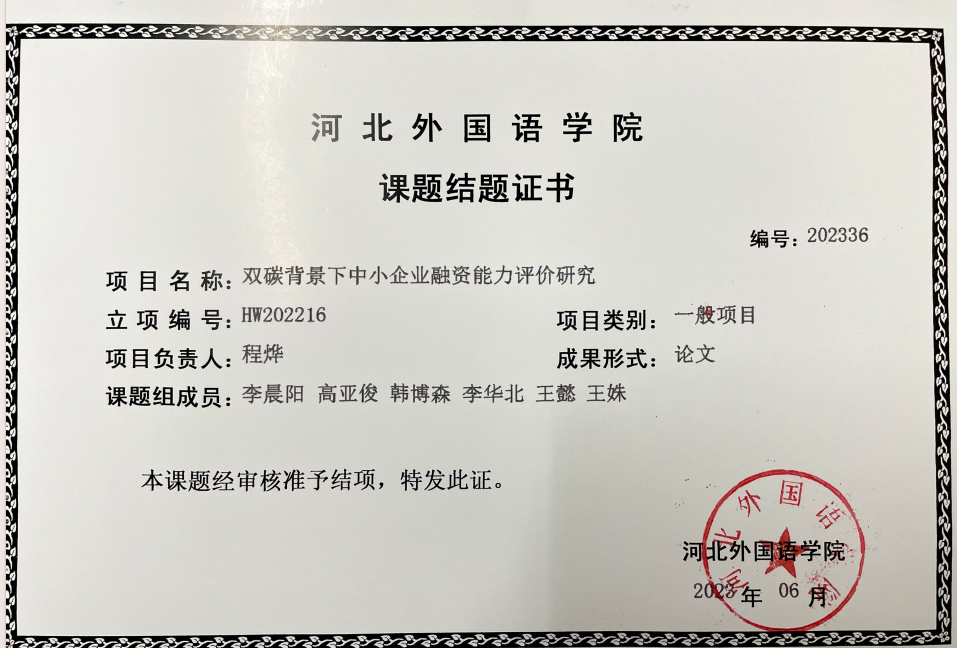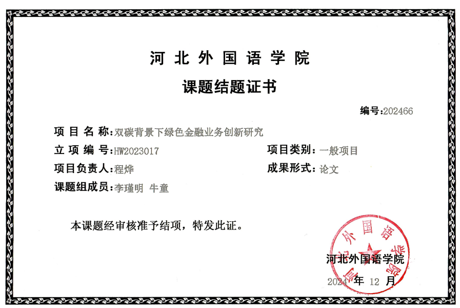 国际金融学院程烨老师牵头,带领韩颖娜、赵思彤、马琰茹三位学生组成科研小组,聚焦“双碳”战略下的金融实践命题,开展“双碳背景下绿色信贷业务创新研究”,其成果论文《“双碳”愿景下的绿色信贷发展研究》成功见刊,除此之外科研小组还发表一部著作,成功结项两个课题,成为我院师生协同攻关绿色金融课题的典型案例。